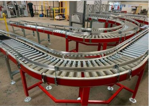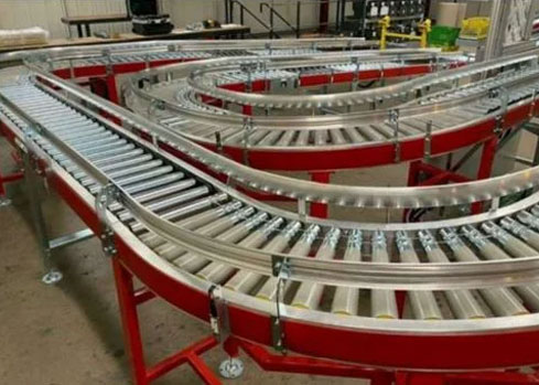 The system includes a combination of roller conveyors, belt conveyors, and inclined conveyors arranged in a structured layout to support continuous material flow. Curved conveyor sections enable smooth directional changes, while elevation changes are managed through inclined conveyor systems.